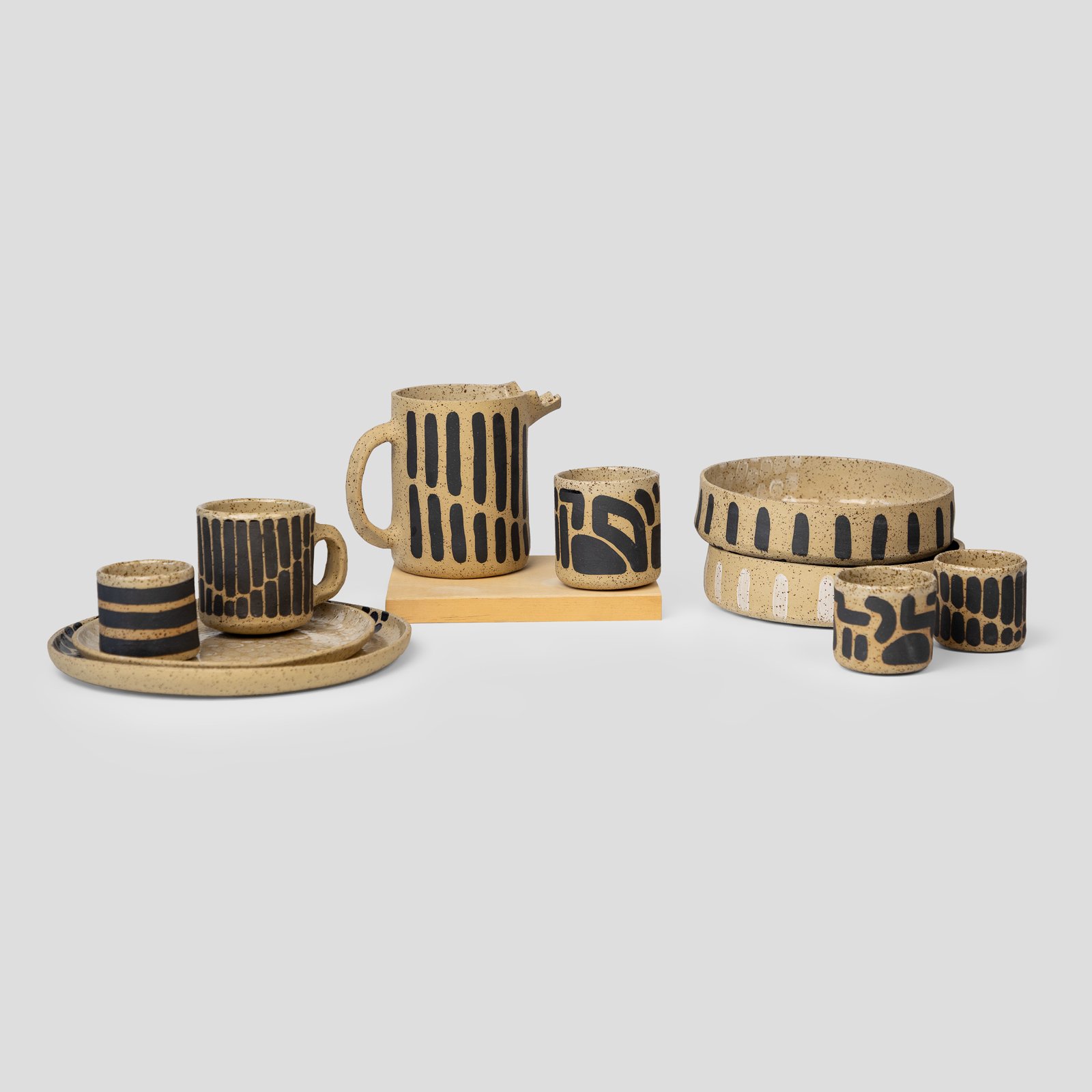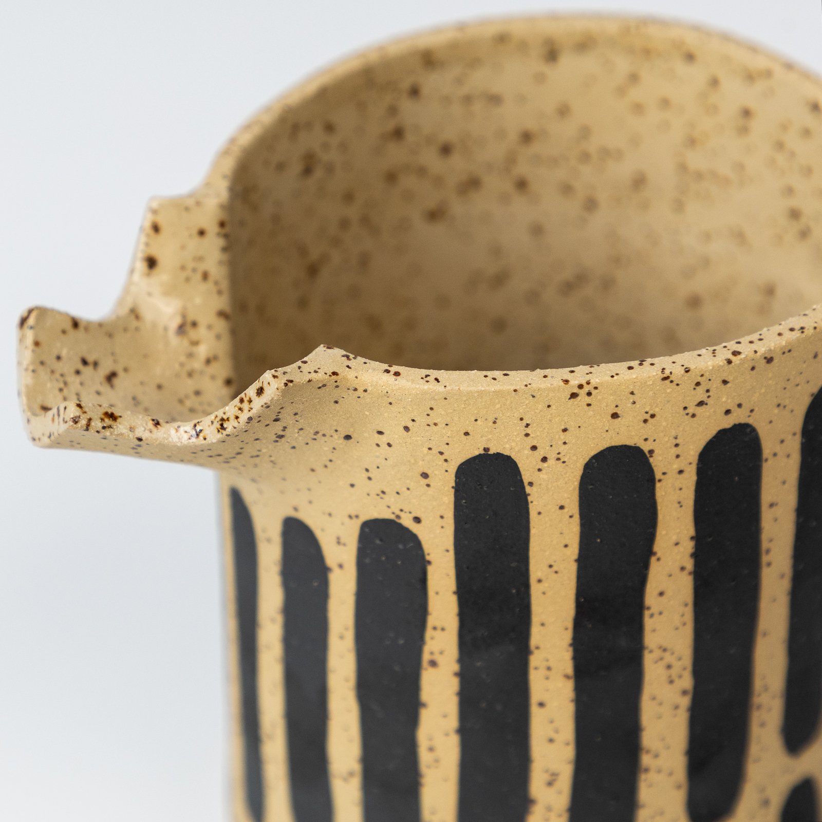 Απολαύστε το νερό ή το αγαπημένο σας ποτό με αυτή την όμορφη, χειροποίητη κανάτα. Κατασκευασμένη από μπέζ πιτσιλωτό πηλό και διακοσμημένη με λιτές μαύρες γραμμές, αποπνέει φυσική αρμονία. Το εσωτερικό και το χείλος είναι καλυμμένα με διάφανο γυάλωμα για απαλή αίσθηση, ενώ το εξωτερικό παραμένει ακατέργαστο, προσφέροντας μια ζεστή, γήινη υφή στα χέρια σας.