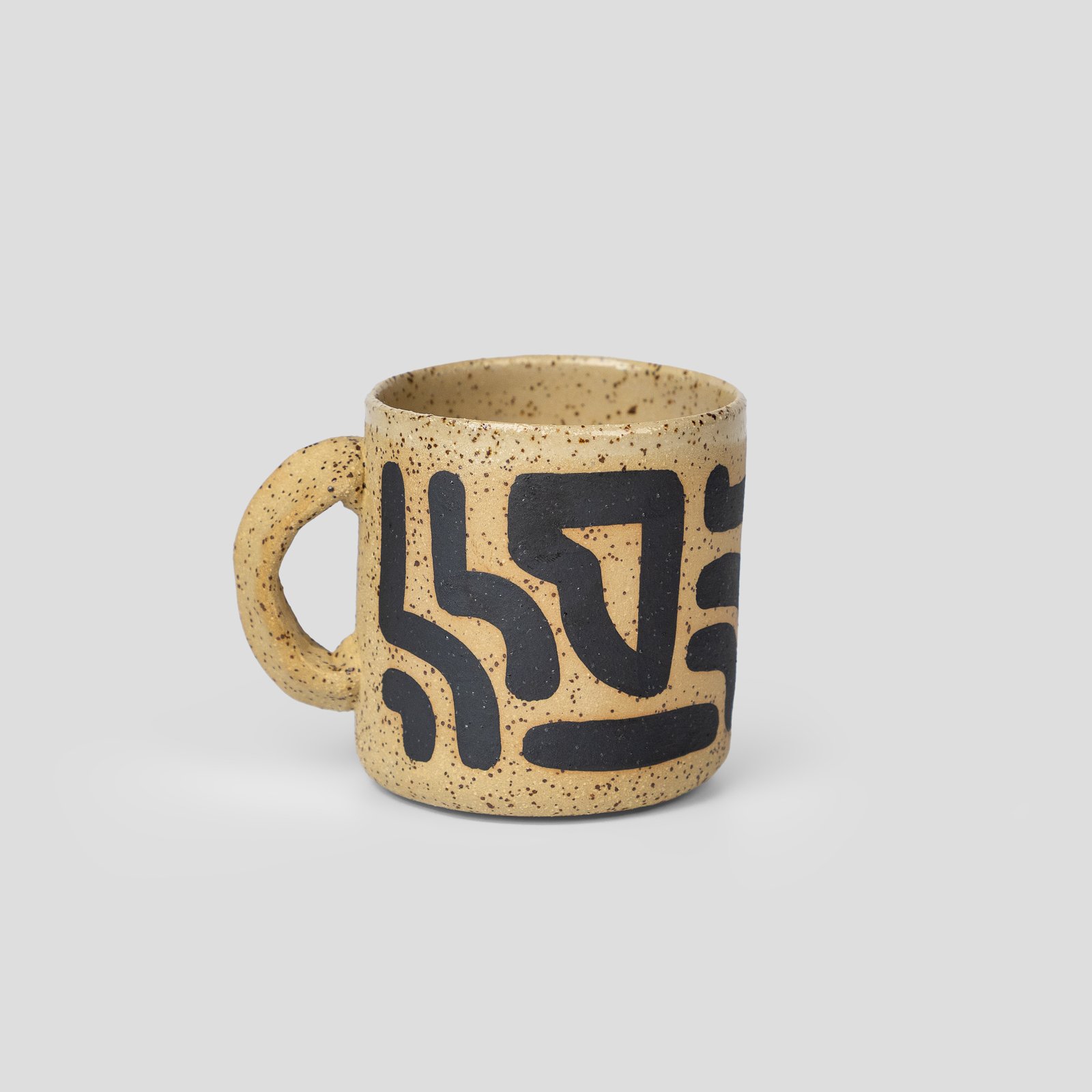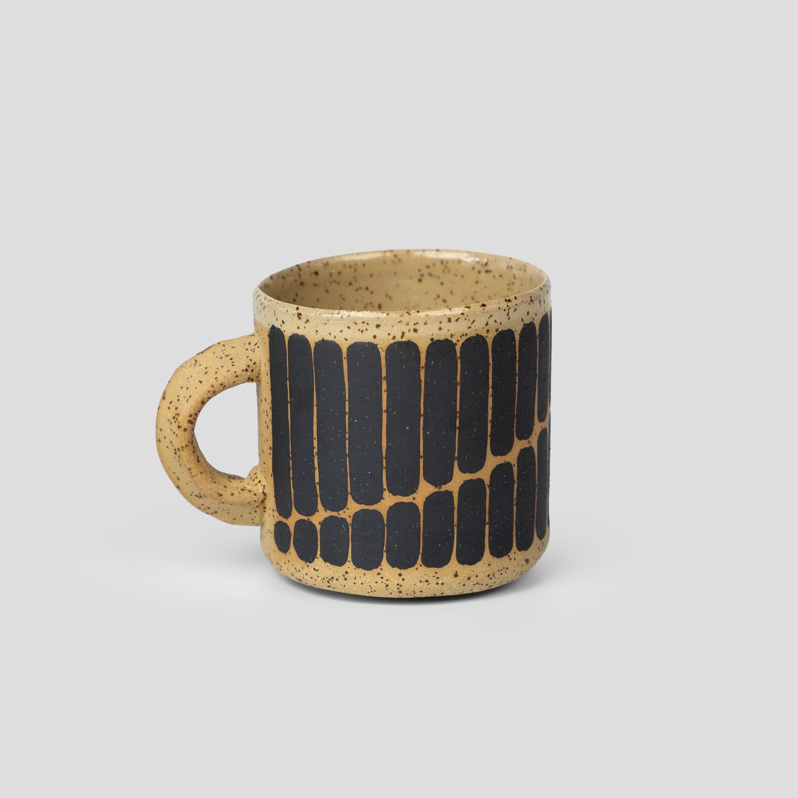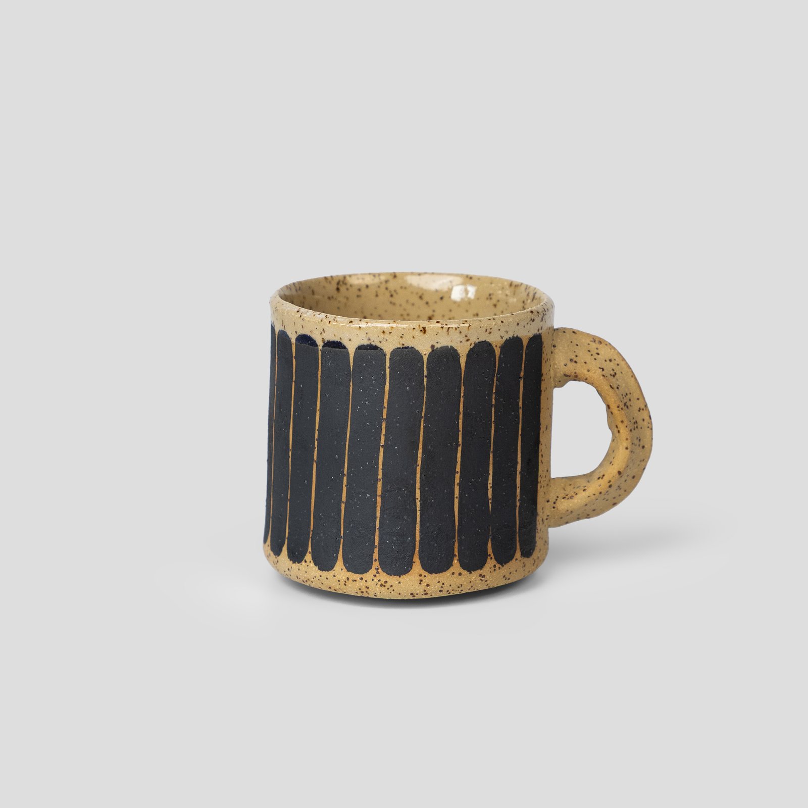 Απολαύστε τον αγαπημένο σας καφέ ή τσάι σε αυτή την όμορφη, χειροποίητη κούπα. Κατασκευασμένη από μπέζ πιτσιλωτό πηλό και διακοσμημένη με λιτές μαύρες γραμμές, αποπνέει φυσική αρμονία. Το εσωτερικό και το χείλος είναι καλυμμένα με διάφανο γυάλωμα για απαλή αίσθηση, ενώ το εξωτερικό παραμένει ακατέργαστο, προσφέροντας μια ζεστή, γήινη υφή στα χέρια σας. Η καμπυλωτή της βάση χαρίζει κομψότητα και ισορροπία σε κάθε γουλιά.