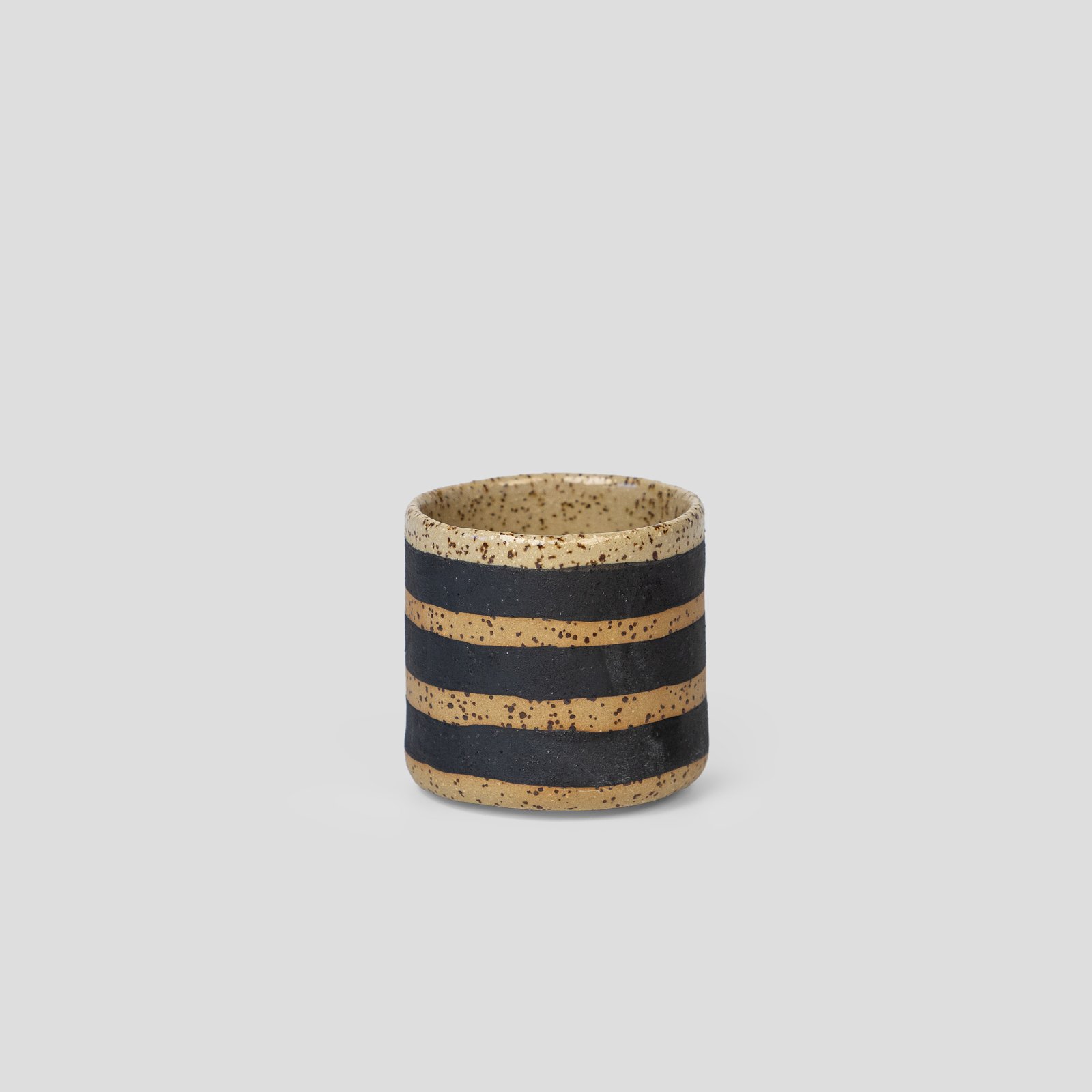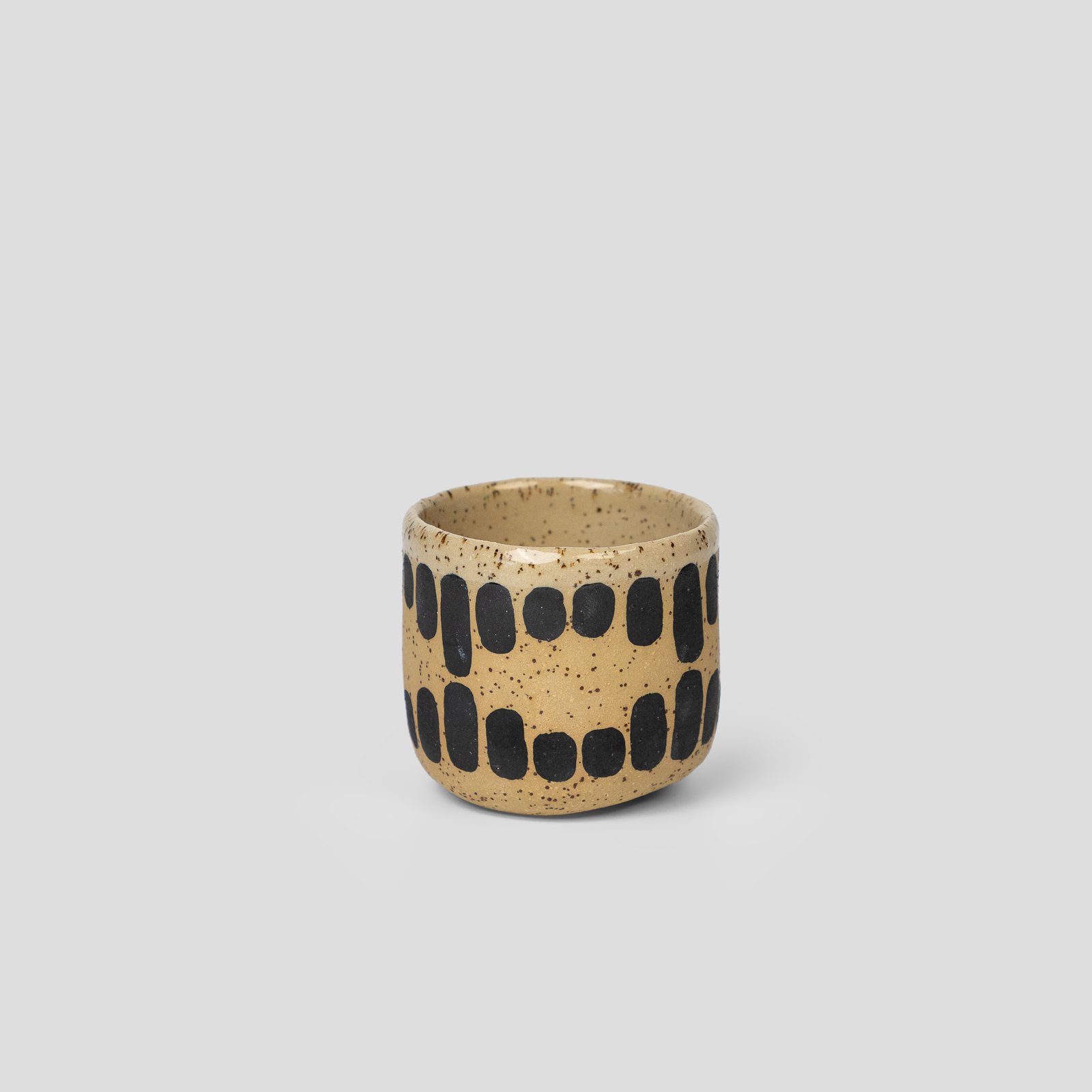 Αναβαθμίστε την καθημερινή σας τελετουργία του espresso με αυτό το μοναδικό, χειροποίητο κουπάκι. Κατασκευασμένο από μπέζ πιτσιλωτό πηλό με λεπτομέρειες από μαύρες γραμμικές διακοσμήσεις, είναι ένα μικρό έργο τέχνης. Το εσωτερικό και το χείλος έχουν διάφανο γυάλωμα για απαλή αίσθηση, ενώ το εξωτερικό παραμένει ακατέργαστο, προσφέροντας μια φυσική και ζεστή υφή. Η καμπυλωτή βάση του προσθέτει μια διακριτική κομψότητα.