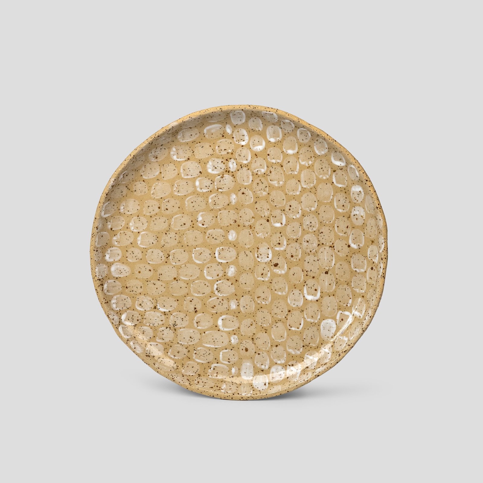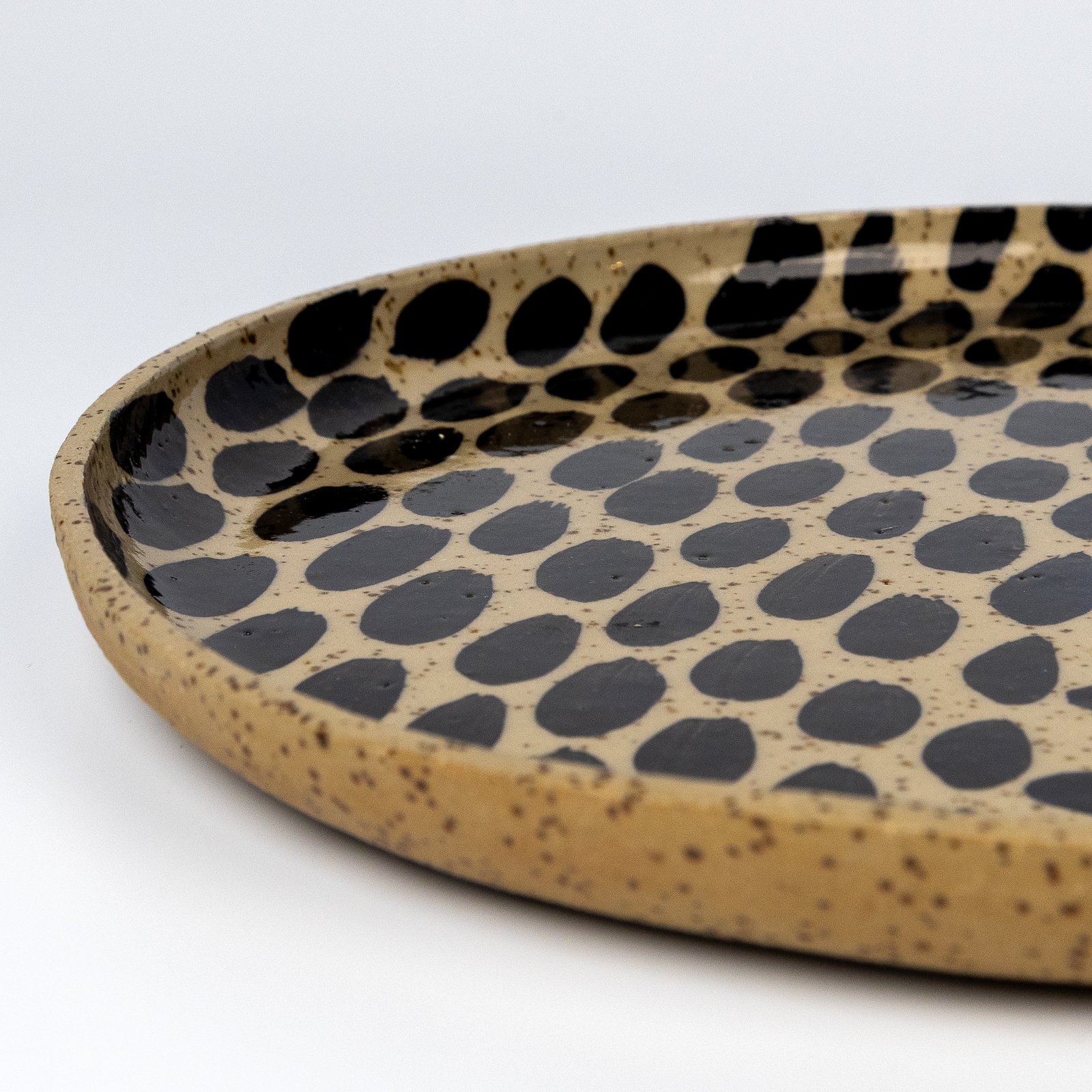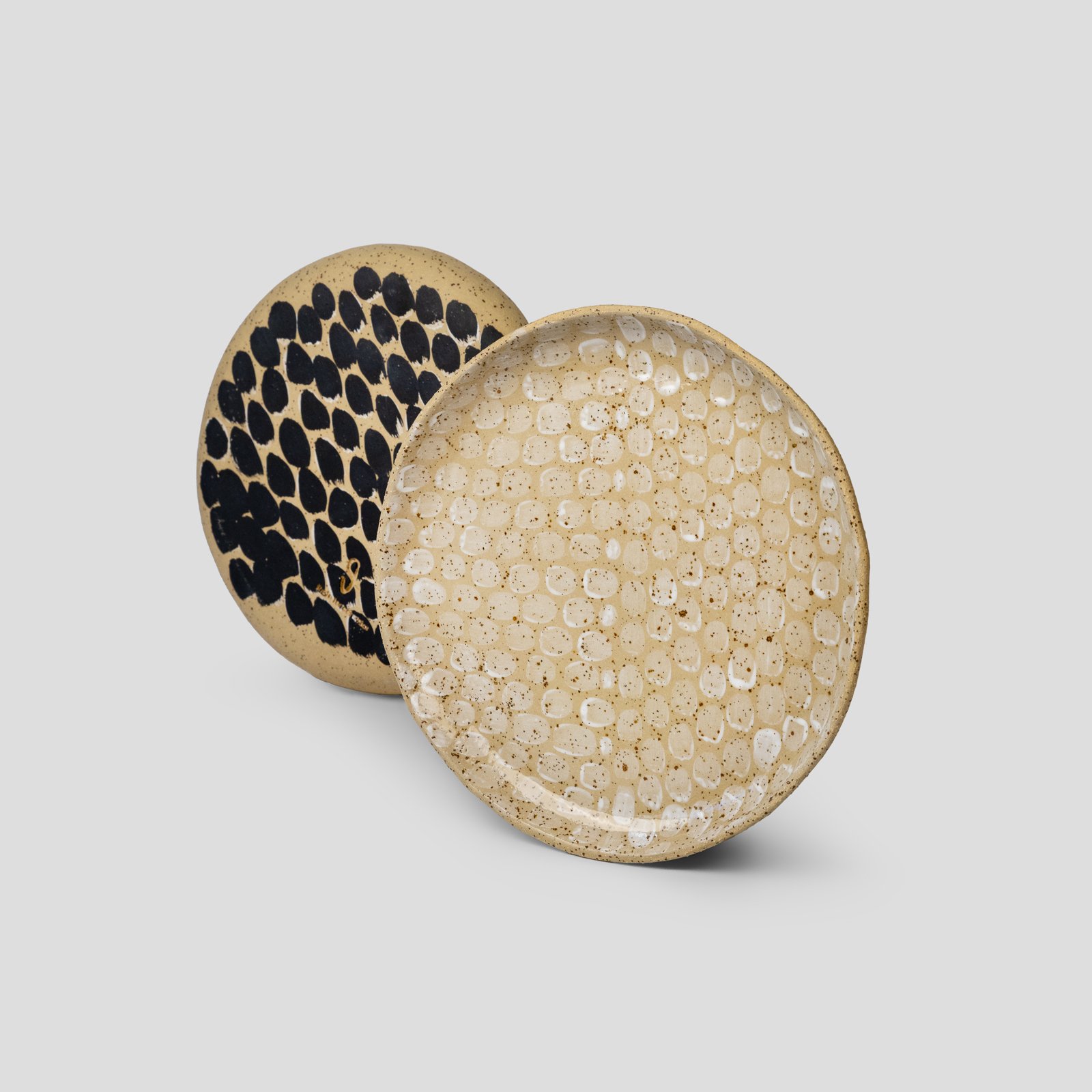 Αυτό το μοναδικό, χειροποίητο πιάτο είναι το ιδανικό μέγεθος για επιδόρπια, ορεκτικά και σνακ. Κατασκευασμένο από μπέζ πιτσιλωτό πηλό με λεπτές μαύρες και λευκές γραμμικές λεπτομέρειες, προσθέτει μια πινελιά καλλιτεχνικής γοητείας στο τραπέζι σας. Το εσωτερικό του καλύπτεται από διάφανο γυάλωμα, ενώ το εξωτερικό παραμένει ακατέργαστο για μια αυθεντική, φυσική υφή.